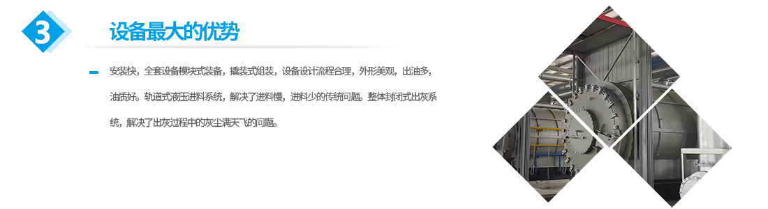 公司生產(chǎn)的設(shè)備的優(yōu)勢(shì):安裝快,全套設(shè)備模塊式裝備,撬裝式組裝,設(shè)備設(shè)計(jì)流程合理,外形美觀,出油多,油質(zhì)好。軌道式液壓進(jìn)料系統(tǒng),解決了進(jìn)料慢,進(jìn)料少的傳統(tǒng)問題。整體封閉式出灰系統(tǒng),解決了出灰過程中的灰塵滿天飛的問題。